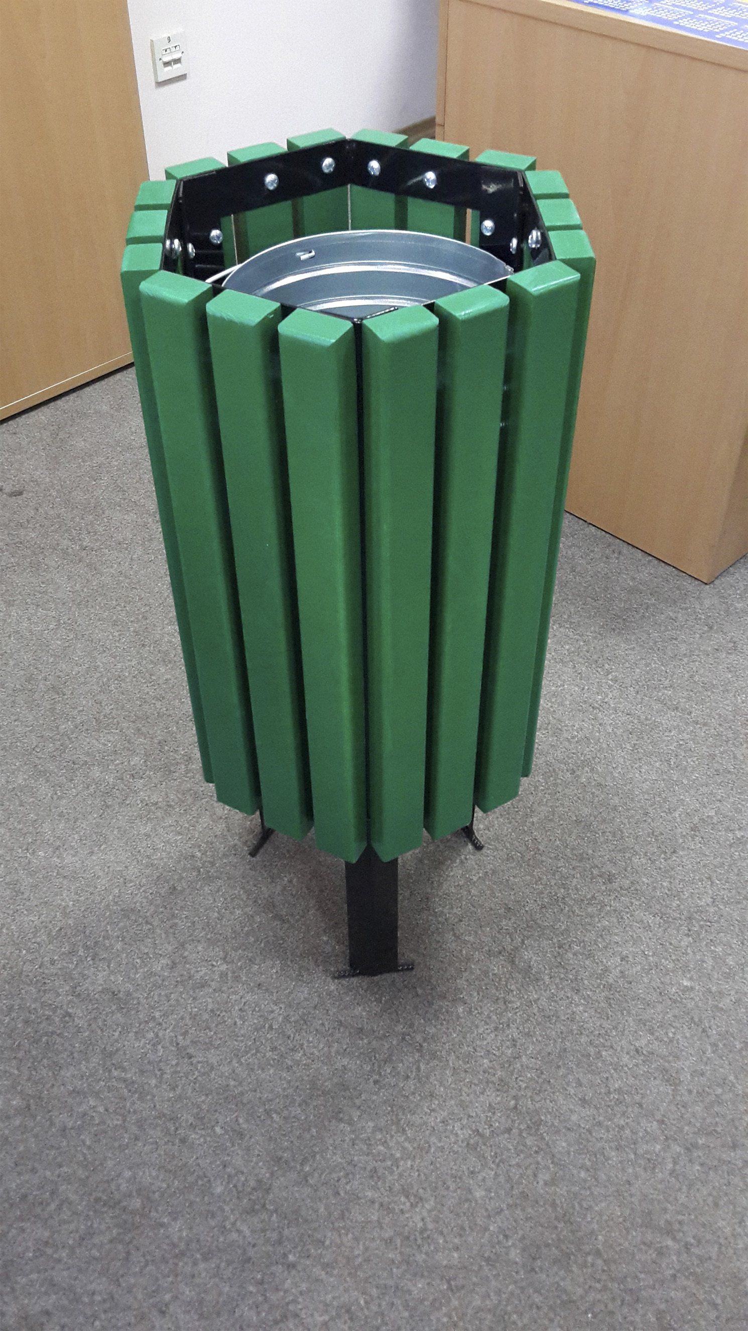 Металлический каркас из стальной трубы разного диаметра и формы — обработка дробеструйная с последующим полимерным нанесением краски двумя слоями. Лаги выполнены из сухих досок хвойных пород, ппокрыты 2-я слоями грунта и 2-я слоями краски промышленной группы на водной основе со специальной дополнительной обработкой торцов фанеры. Ведро из листового металла.