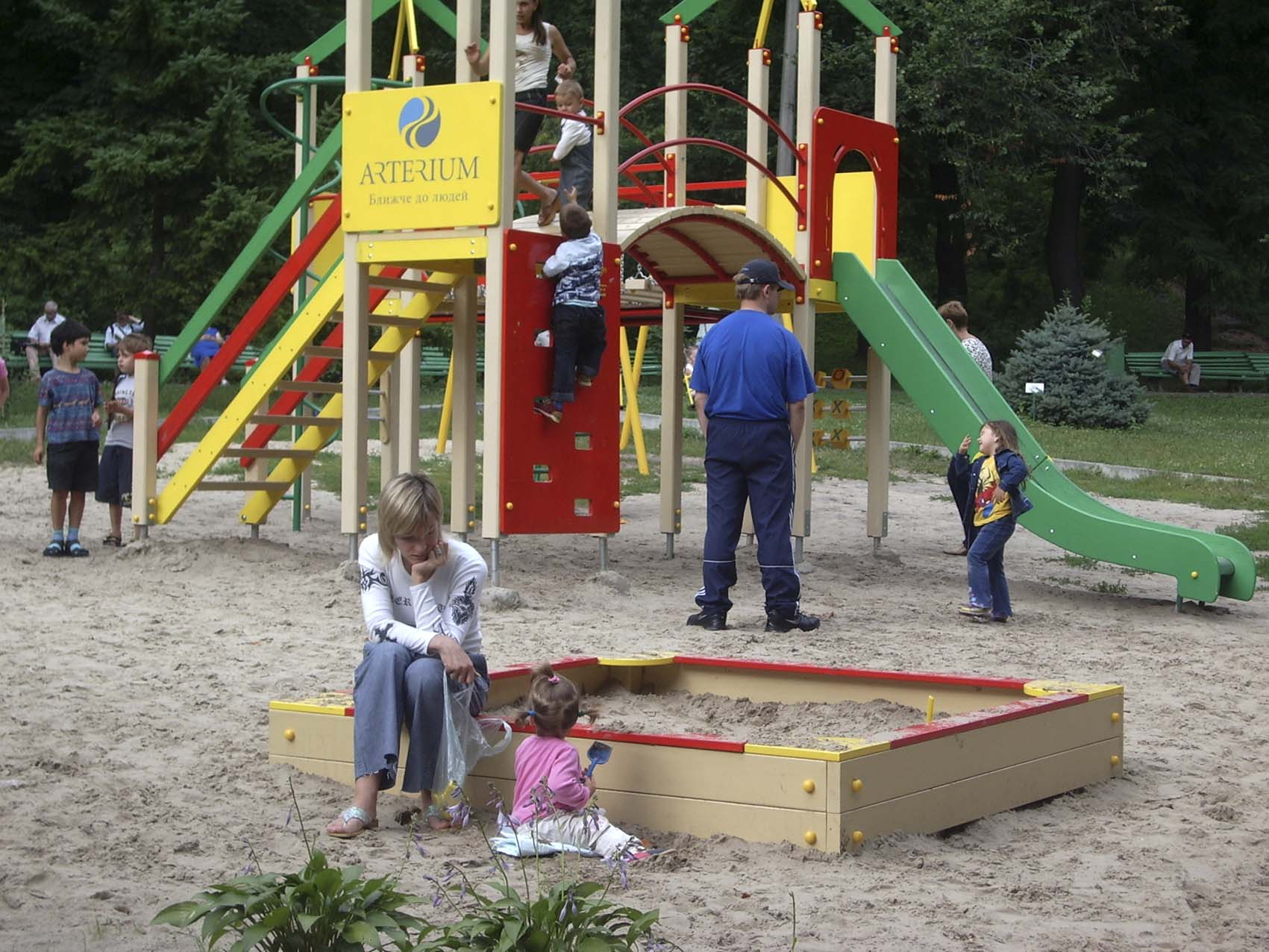 По периметру песочницы установлены скамейки, чтобы выложить игрушки и родителям было удобнее играть с ребенком.
