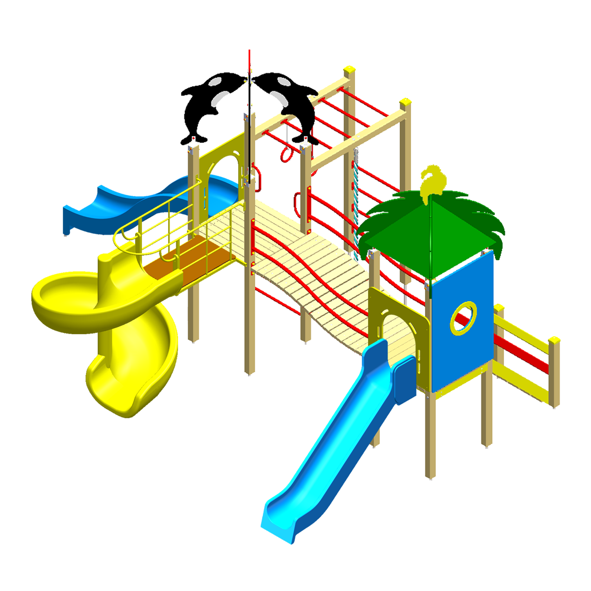 Основная обшивка комплекса и отдельные элементы из влагостойкой фанеры толщиной 21- 24 мм, покрытие в 2-а слоя грунтовки и 2-а слоя краски промышленной группы на водной основе (производитель Германия, Финляндия) со специальной дополнительной обработкой торцов фанеры.