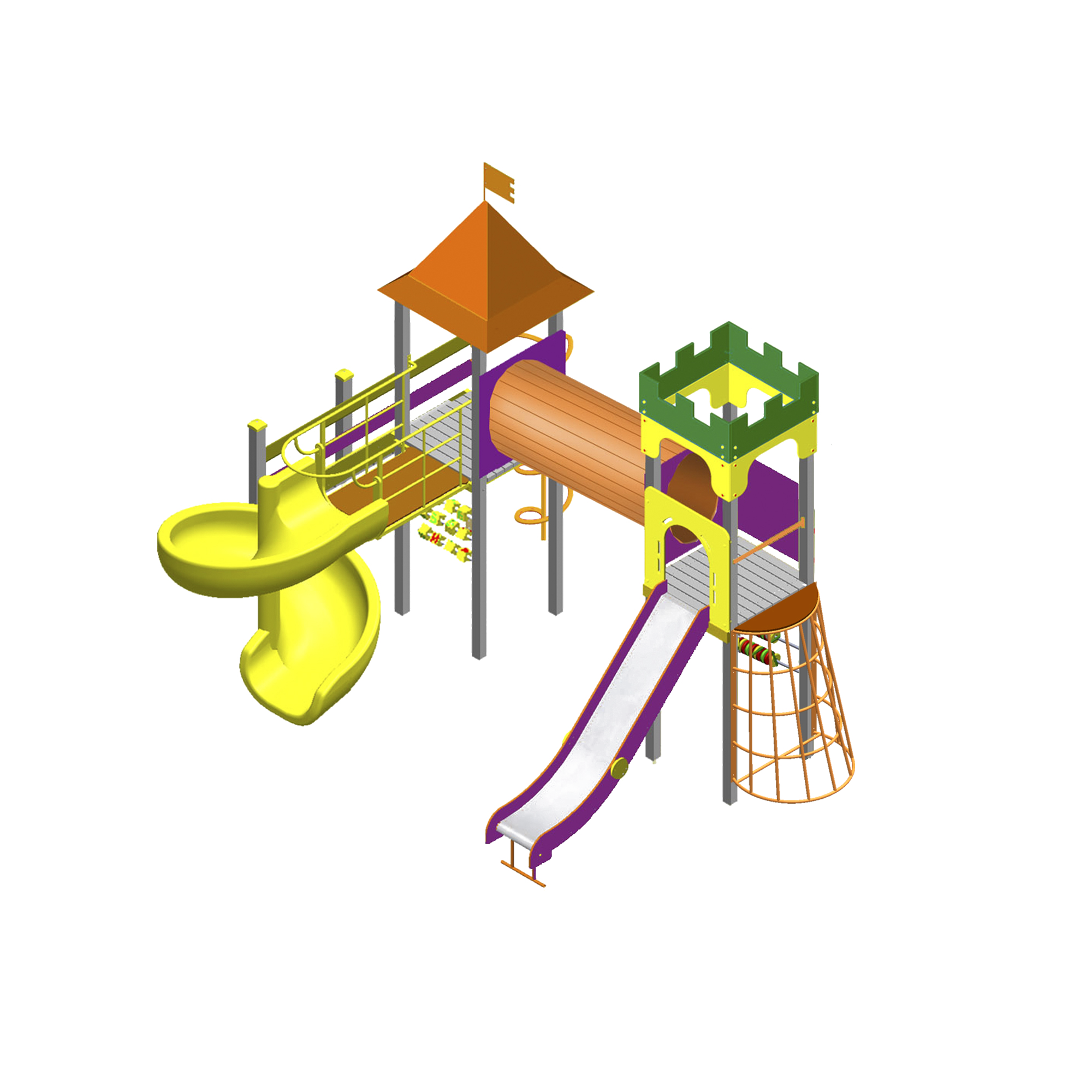 Две горки высотой 1,5 м до башни: пластиковая спиральная горка и горка из листовой нержавеющей стали толщиной 1,5-2 мм без сварных швов, благодаря чему обеспечивается плавный и главное безопасный спуск ребенка.
