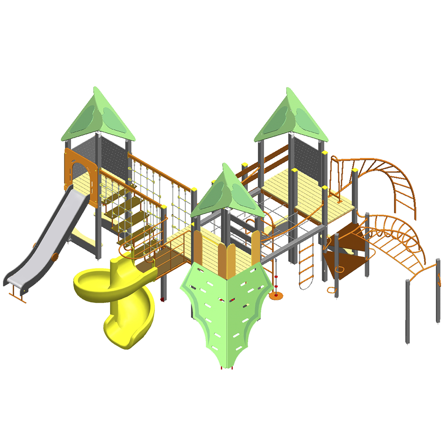 Дві гірки висотою 1,5м до башти: пластикова спіральна гірка та гірка з листової нержавіючої сталі товщиною 1,5-2 мм без зварювальних швів, завдяки чому забезпечується плавний та головне безпечний спуск дитини.