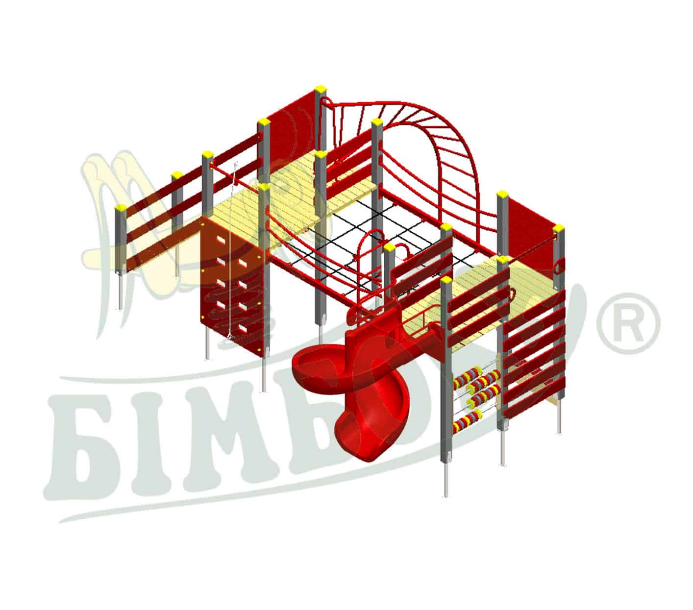 Опорні стійки обладнання виготовлені з сухого дерева хвойних порід (брус клеєний 100х100мм), оснащуються металевим анкером, при необхідності пластиковим ковпаком.