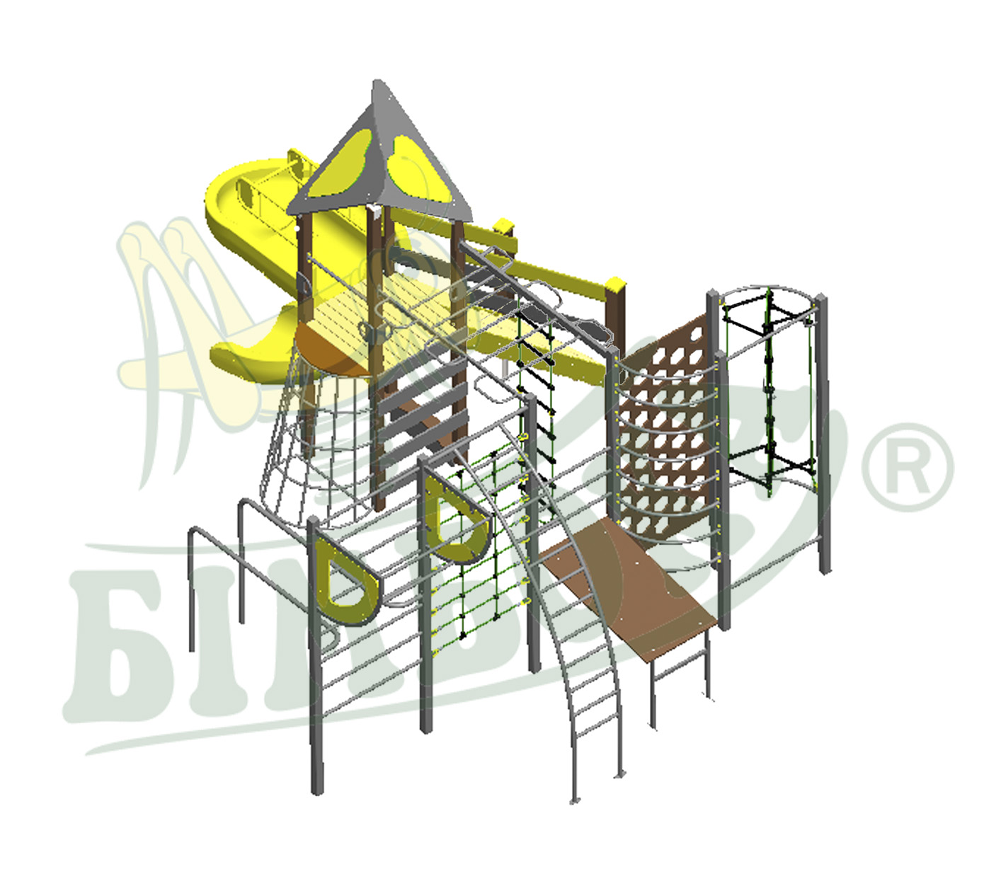В элементах комплекса используются троса с металлическими жилами внешний слой которых из акрила, внутри металлические жилы и с пластиковыми соединениями (европейский стандарт, ТUV сертификат).