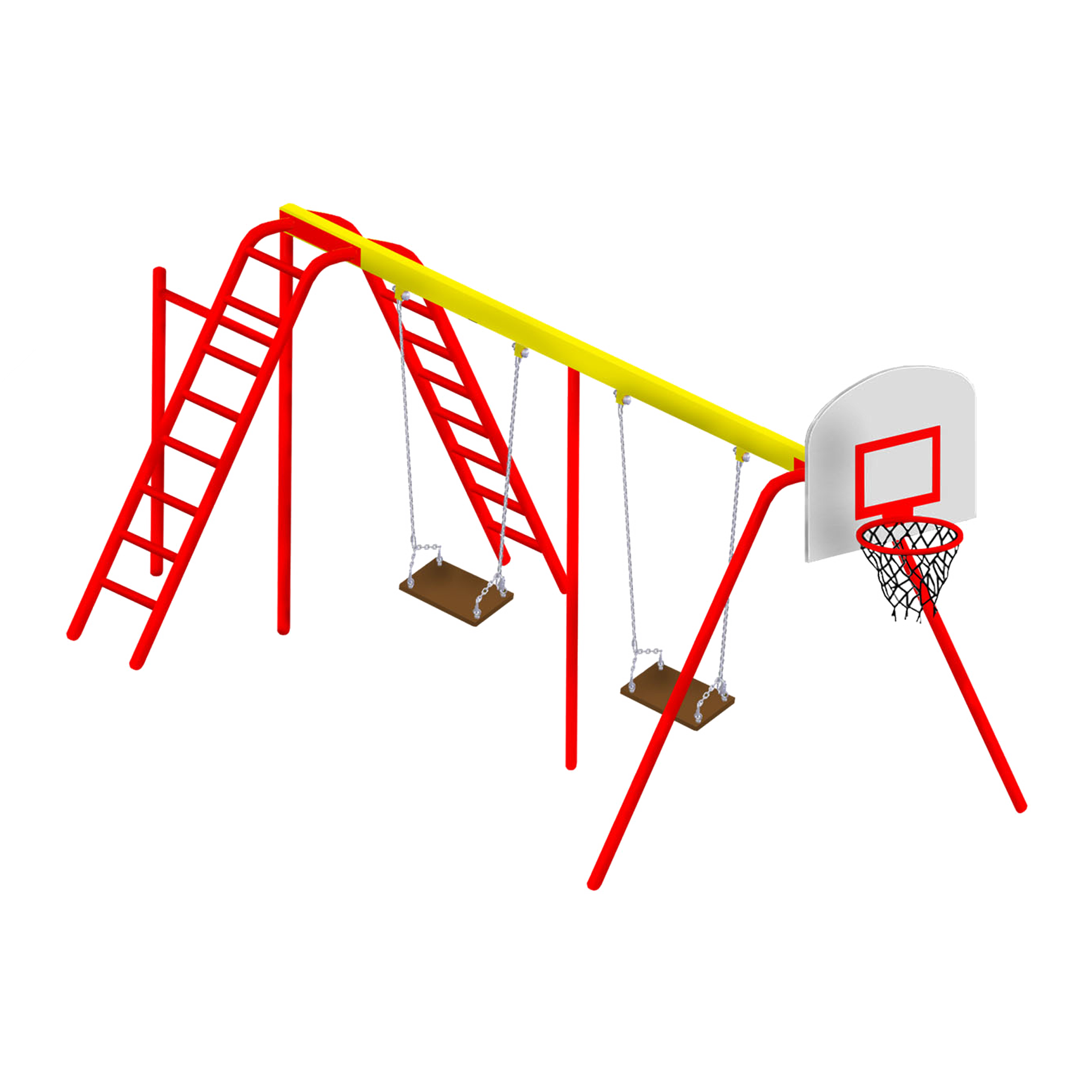 В комплект комплекса входят две качели на гибком подвесе (оцинкованные литые цепи) с открытыми сидениями, с ламинированной влагостойкой фанеры со специальным покрытием против скольжения.