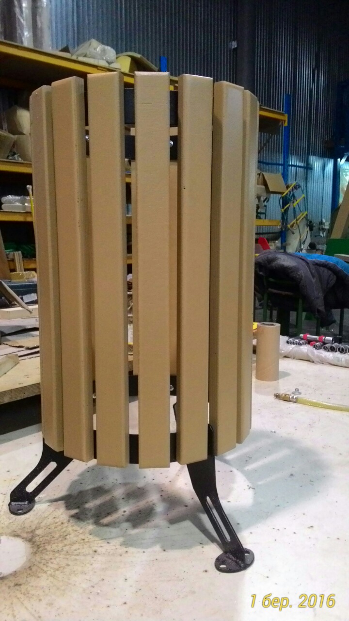 Металевий каркас із стальної труби різного діаметру та форми – обробка дробеструйна з подальшим полімерним нанесенням фарби двома шарами. Лаги виконані з сухих досок хвойних порід, покриття в 2-а шари ґрунту 2-а шари фарби промислової групи на водній основі з спеціальною додатковою обробкою торців. Відро з листового металу.