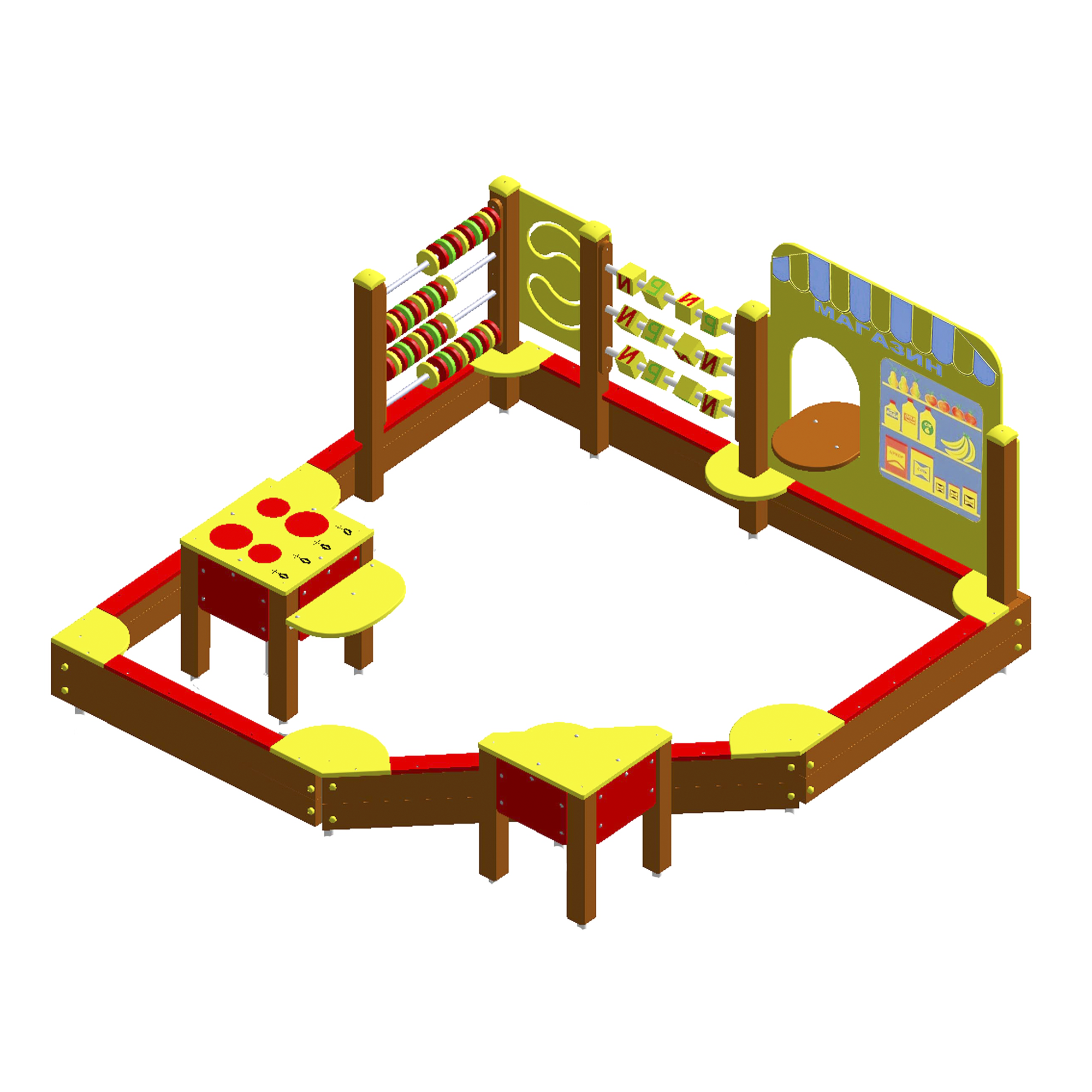 Пісочниця розміром 3000х3000мм, включає в себе ігрові елементи: рахівницю, алфавіт чи хрестики нолики, змійку та додаткові поверхні для гри.