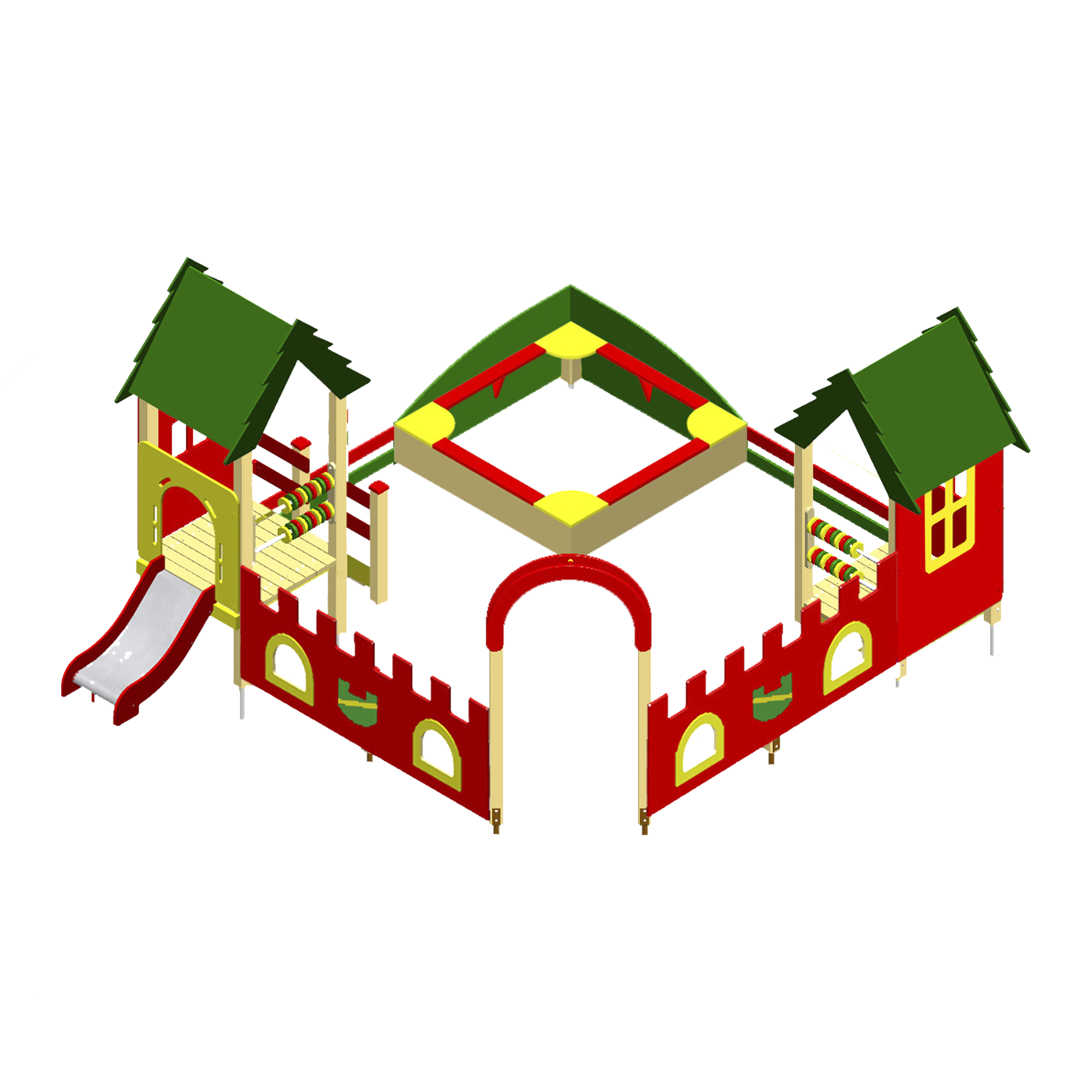 Ігрова зона – чудове місце для гри дітей та розвитку їх фантазії, обмежена парканчиком-вежею з віконцями, має велику кількість функцій: ігрові будиночки з гіркою висотою 0,6м для маленьких дітей, розвиваючі елементи, пісочницю з лавками.