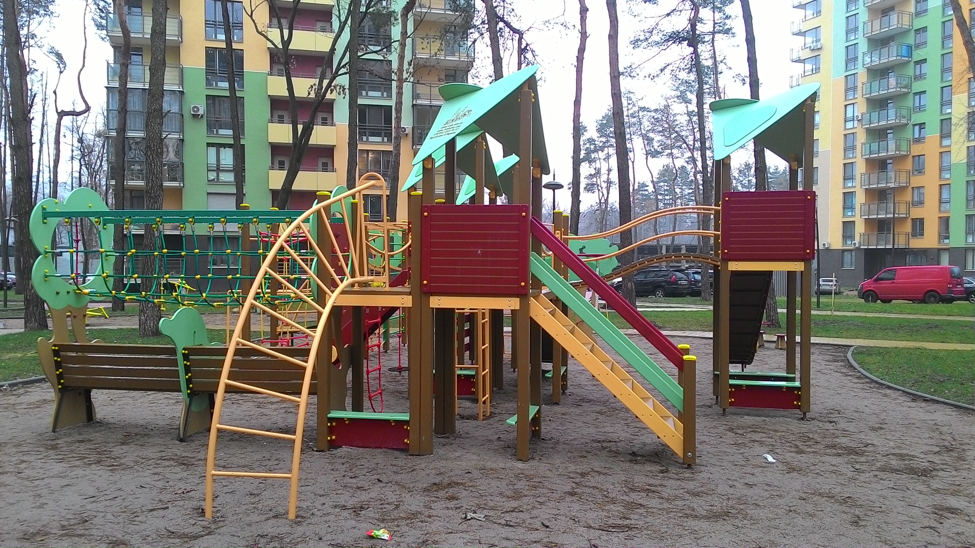 Борта горок, основная обшивка комплекса и отдельные элементы из влагостойкой фанеры толщиной 21- 24 мм, покрыты 2-я слоями грунта и 2-я слоями краски промышленной группы на водной основе (производитель Германия, Финляндия) со специальной дополнительной обработкой торцов фанеры.