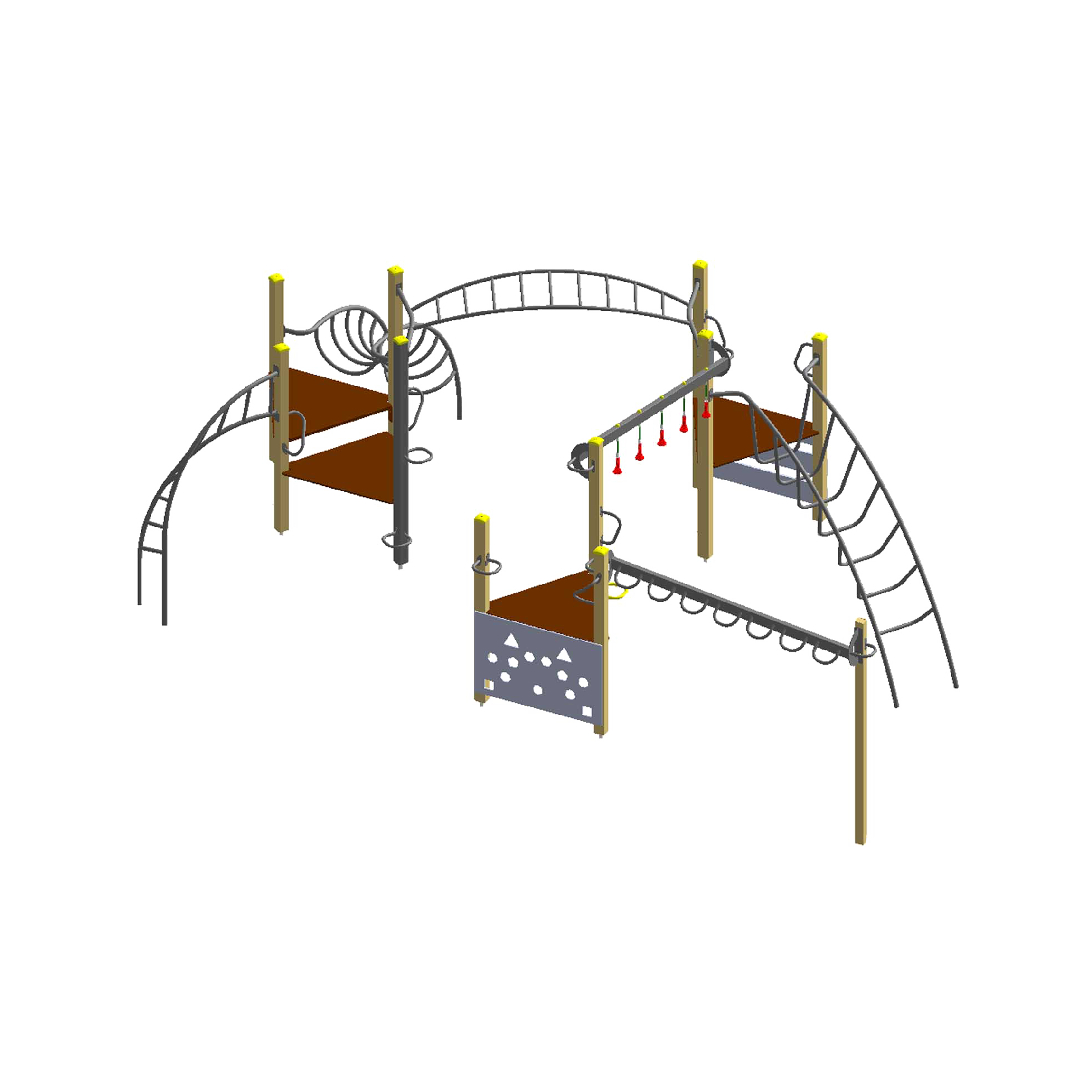 Металлические конструкции комплекса изготовлены из стальной трубы разного диаметра и формы, обработка дробеструйная с последующим полимерным нанесением краски двумя слоями.